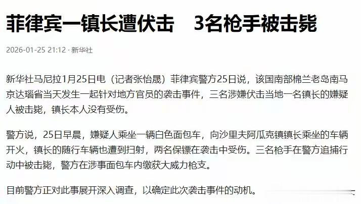 陆地上的戏码同样血腥。1月25日,南马京达瑙省镇长遭遇专业武装伏击,RPG火箭弹直接轰向防弹车——这哪里是治安事件?分明是军阀式“斩首行动”!同一天,小马科斯总统被反对派以“数千亿防洪资金去向成谜”为由弹劾,揭开了菲律宾政治最肮脏的疮疤:所谓“民生工程”,不过是权贵家族的提款机。